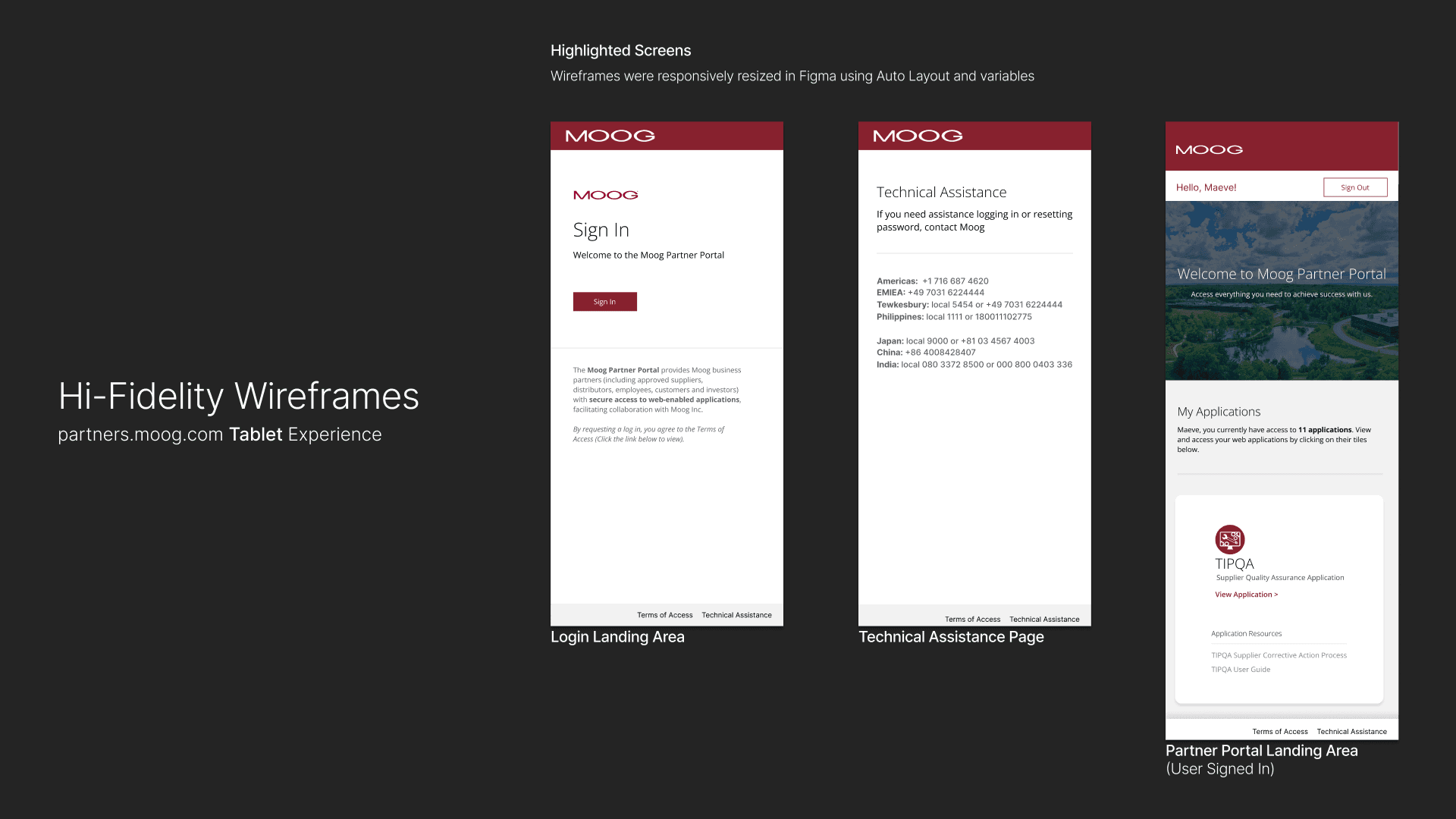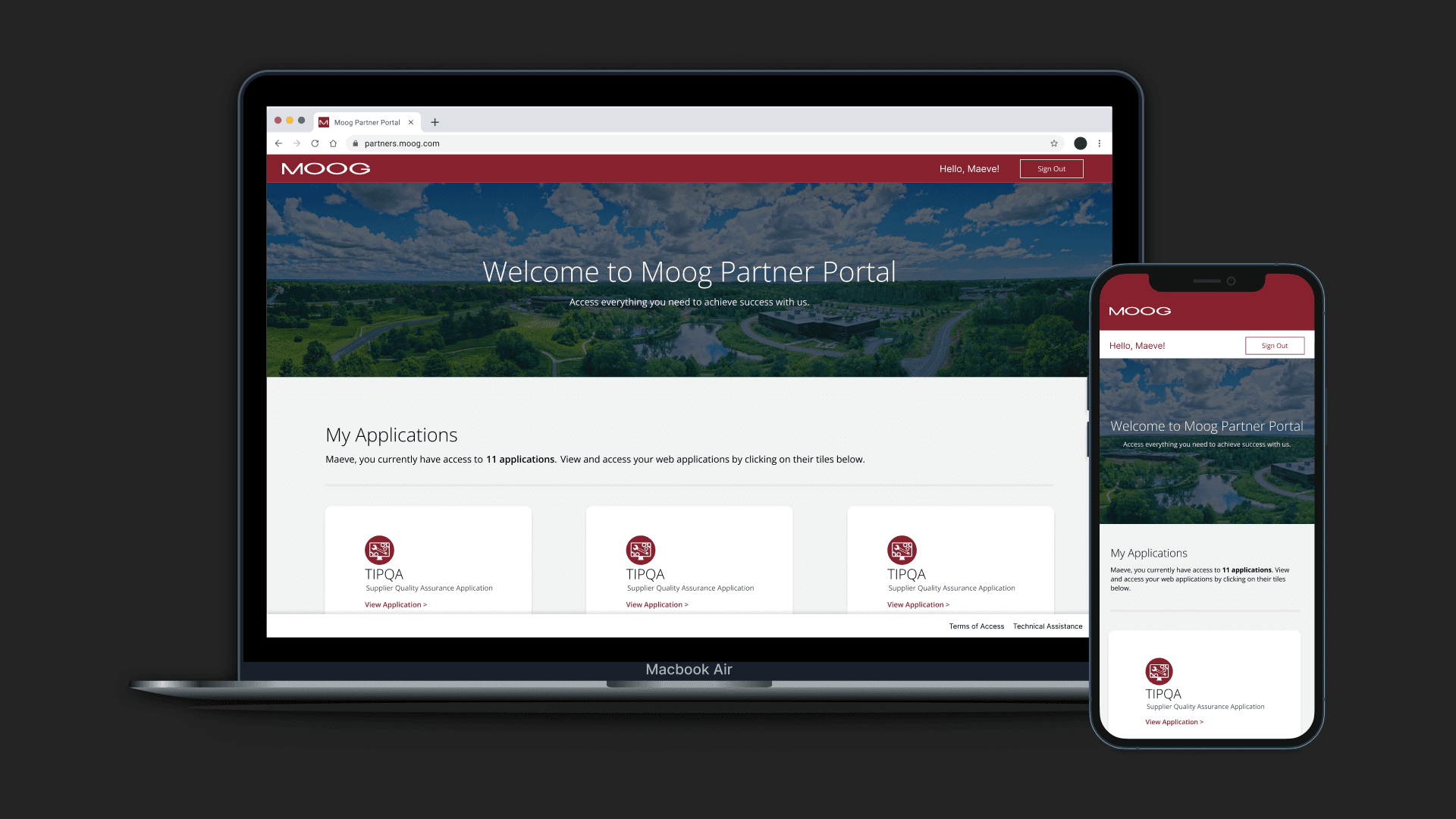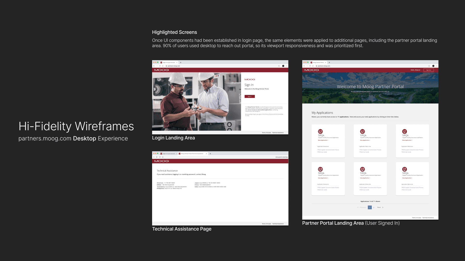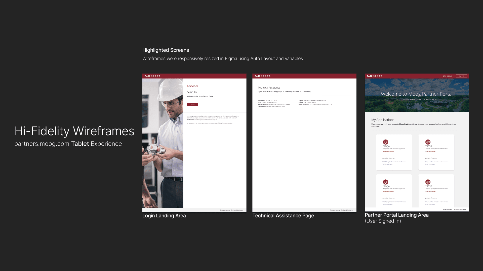 A redesign of Moog’s Partner Portal — an internal/external facing tool used by suppliers, manufacturers, and partner contacts to access Moog applications pertaining to their role. The goal was to improve usability, navigation, and content accessibility for our current set of user types while aligning the portal with updated brand standards.