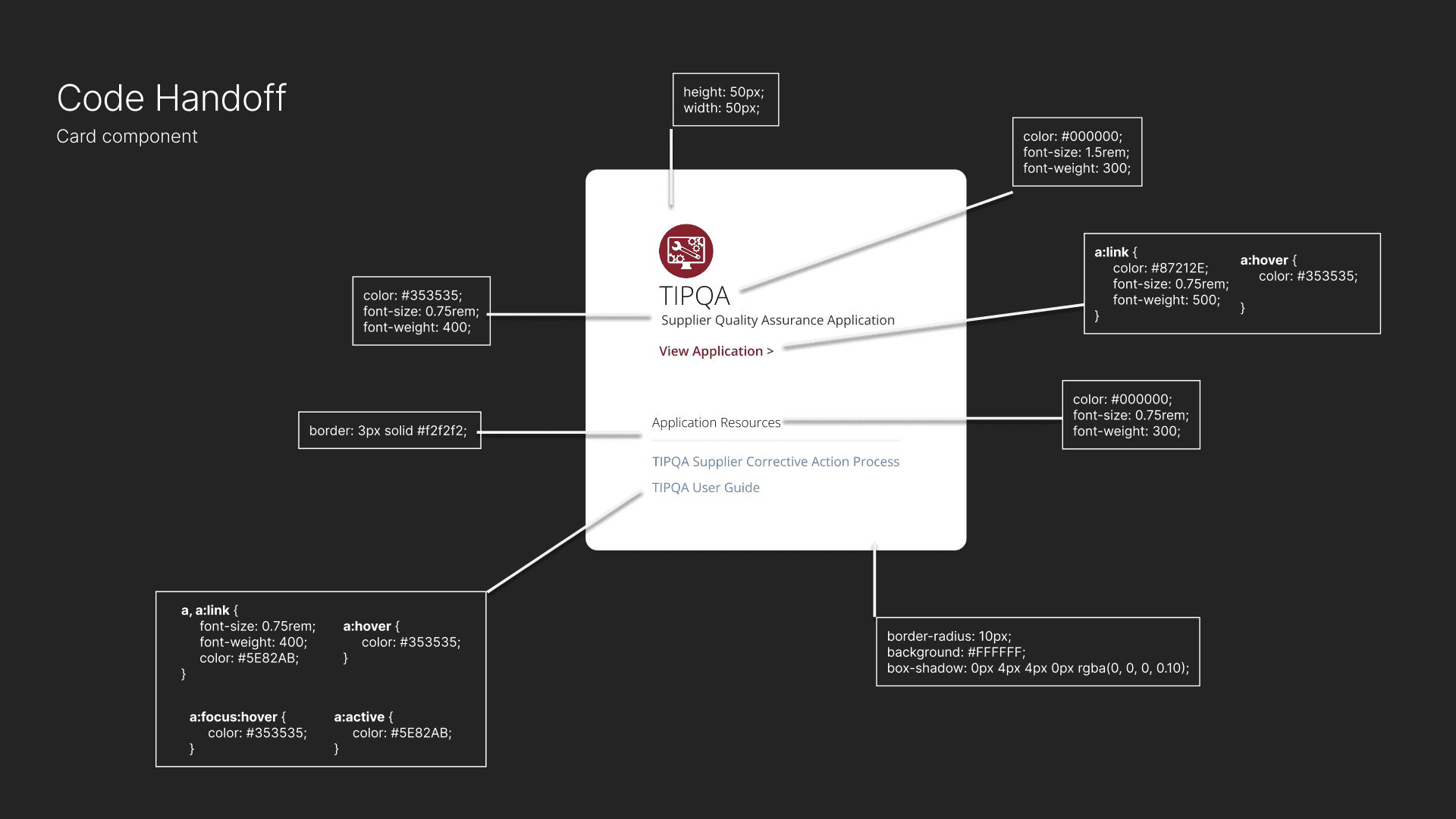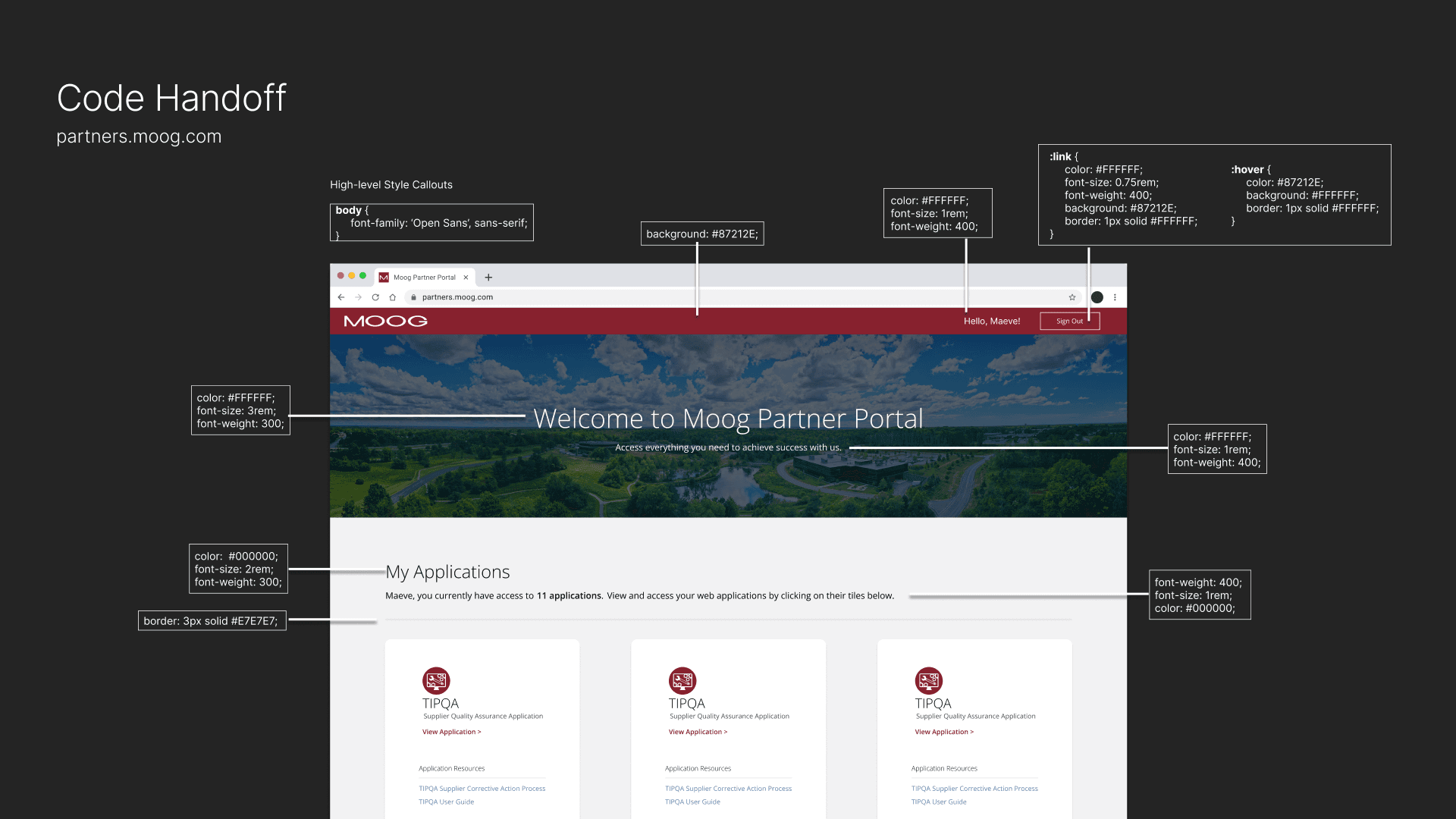 CSS for color, typography, and display properties were handed over to developers for easy implemenation. CSS classes were also handed over if already known for UI component.